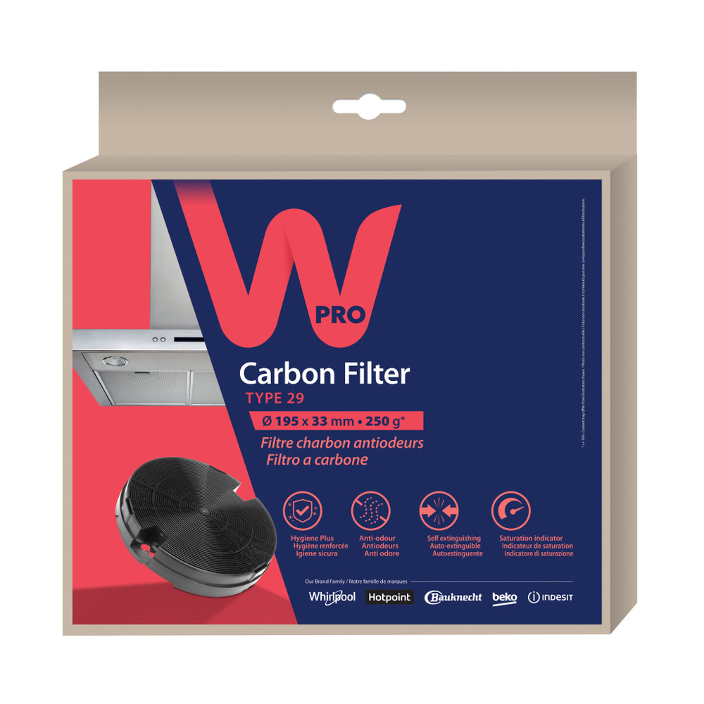 Wpro-kolfiltret absorberar fett och fukt när du lagar mat, och förhindrar dålig lukt i köket. Den absorberande funktionen förhindrar att bakterier sprids i luften. Wpro-kolfiltret har en mättnadsindikator som ändrar färg när du behöver byta filtret. Vi rekommenderar att filtret byts var tredje månad. Typ 29 (Ø195 x 33 mm - 250 g).